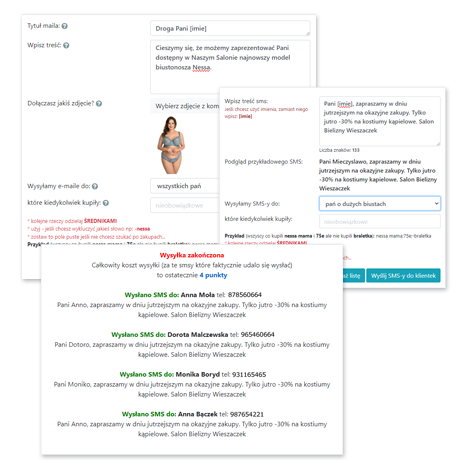 Gdy zamówienie jest do odbioru system pozwala wysłać email lub sms z powiadomieniem do klientki o konieczności odbioru.