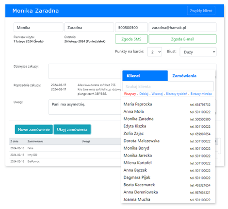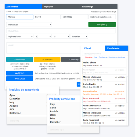 Często trzeba zamówić konkretny model/rozmiar biustonosza. System pozwala nam tego upilnować. Możemy wystawić takie zamówienie określając jego parametry ( producent, rozmiar, kolor, opis, uwagi). System będzie zbierał takie zamówienia i grupował je po producentach, tak, aby można było łatwo mieć nad tym kontrolę. Możemy w zamówieniach oznaczać czy produkt już zamówiliśmy, czy jest do odbioru, czy odebrany czy może zamówienie jest już zakończone. Wszystkie te informacje są wyświetlane za pomocą kolorów na liście wszystkich zamówień.